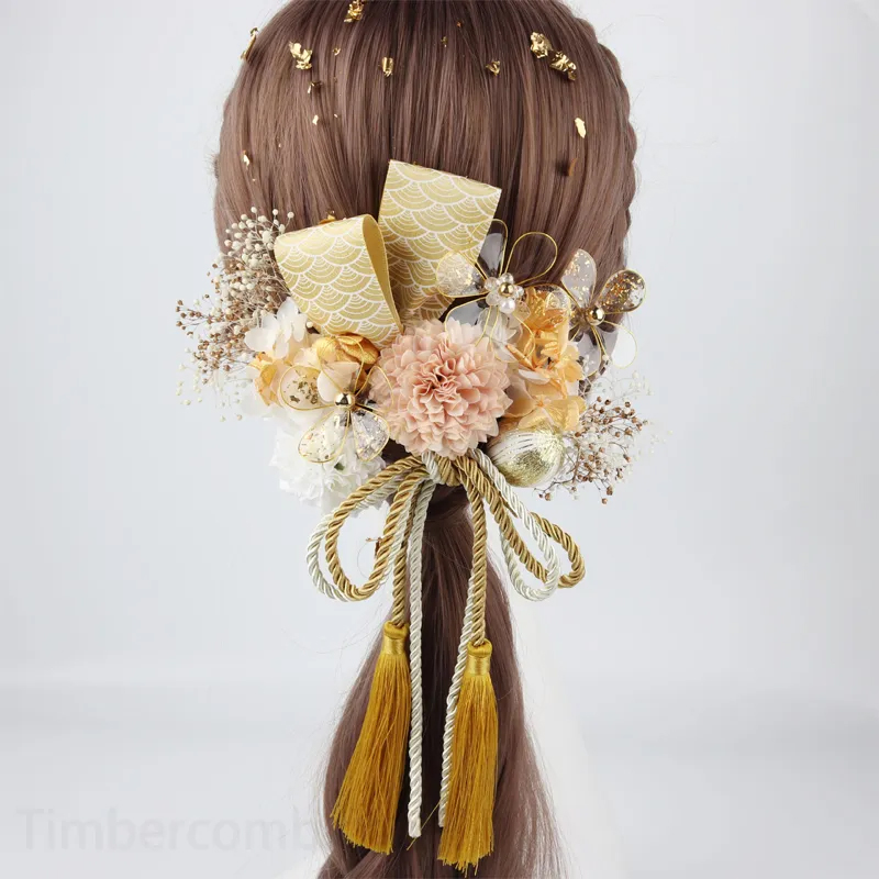 卒業式髪飾り手作り 成人式 和装 結婚式 卒業式 造花飾り 金色 赤色 ドライフラワー風 水晶花の髪飾り ウェディング 花 ヘッドドレス