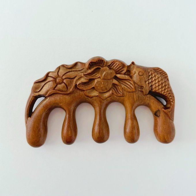 A beautiful wooden comb featuring intricate carvings of lotus flowers and koi, showcasing the brilliance of traditional craftsmanship. Its thick design fits comfortably in the hand and is perfect for scalp and acupressure massage. The lotus symbolizes purity and rebirth, while the koi represents happiness and prosperity, making it an auspicious design perfect for gifts.