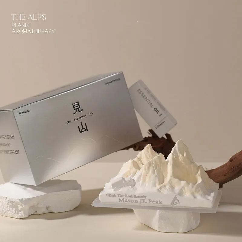 欧州の雄大な山脈をモチーフにした立体造形のアロマストーン。火を使わない安全設計で、車内でも寝室でも、天然石がゆっくりと精油を拡散。
