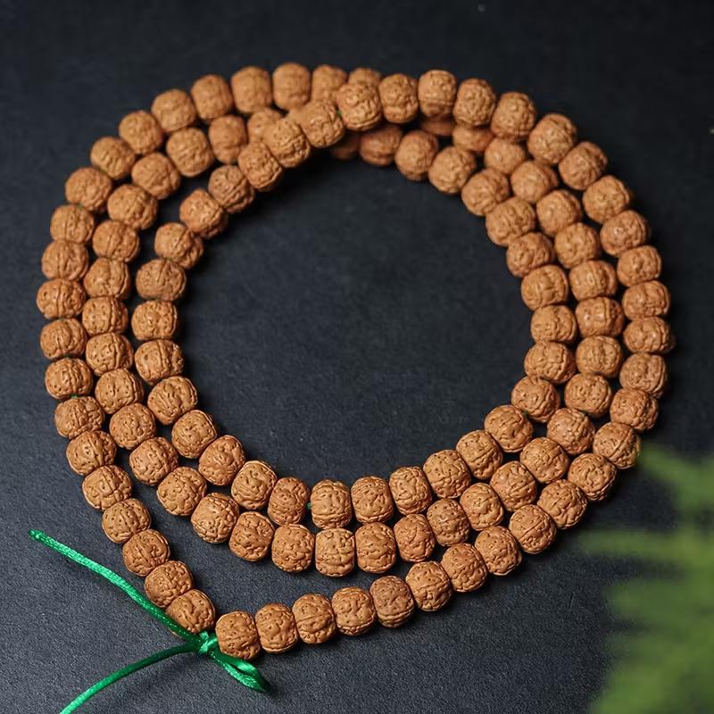 その品質は、木の実の密度と均整の取れた形状、そして自然な色合いで評価されます。特に小粒で揃った実は希少価値が高く、長年使い込むほどに深みのあるツヤのある飴色に変化していくのが特徴です。職人は一つ一つの実を丁寧に研磨し、穴あけを行い、化学処理を施さずに自然の風合いを引き出します。使用するほどに手に馴染み、味わいが増すため、日常的な瞑想やお守りとして、また心落ち着けるファッションアイテムとして、男女を問わずお勧めです。