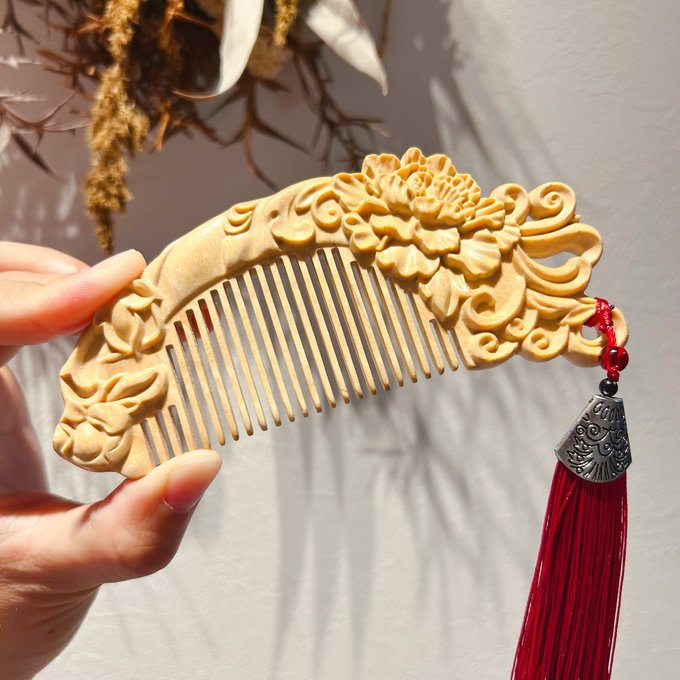 華やか牡丹彫刻つげ櫛 ― 気品と幸福を纏う伝統美