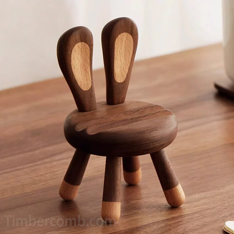 北米産黒ウォルナットの美しい木目を活かした、ウサギのスツール型スマホスタンドです。ぷっくりとしたフォルムと愛らしい表情が魅力のキャラクターミニチェア。お手持ちのスマートフォンを立てかければ、卓上がたちまち可愛らしく癒やしの空間に変わります。実用性とインテリア性を兼ね備えた木製オブジェとして、ギフトにもおすすめ。経年変化による風合いの深まりもお楽しみいただけます。