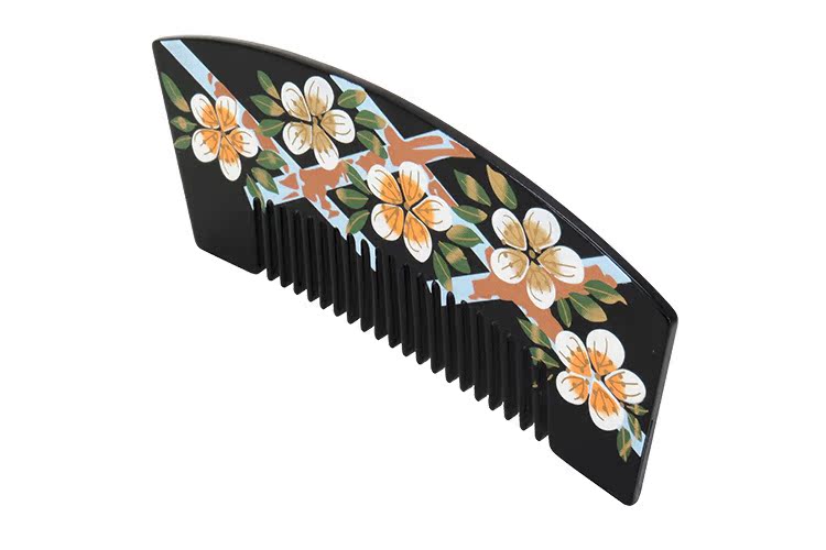 櫛の中央部には、可憐な桜のモチーフをあしらいました。華美になりすぎない、上品で可愛らしいアクセントが、お顔元を柔らかく彩ります。和装はもちろん、シンプルな洋装に合わせても、ひとつあるだけで全体の印象を引き締めます。