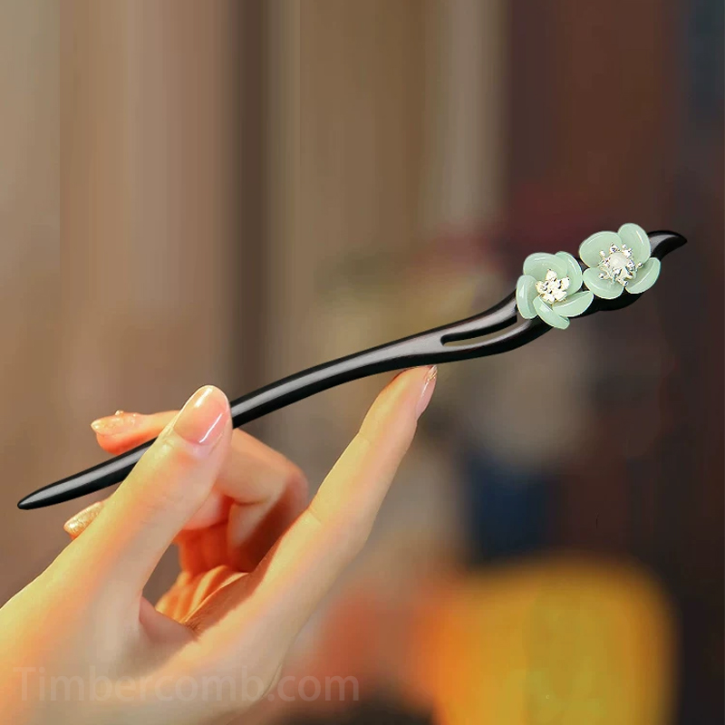 艶やかな黒檀の質感に、清々しいグリーンの花モチーフをあしらい、光を受けて輝くクリスタルがアクセントとなり、和装はもちろん普段のおしゃれまで、髪型に品格と優雅さをプラスします。