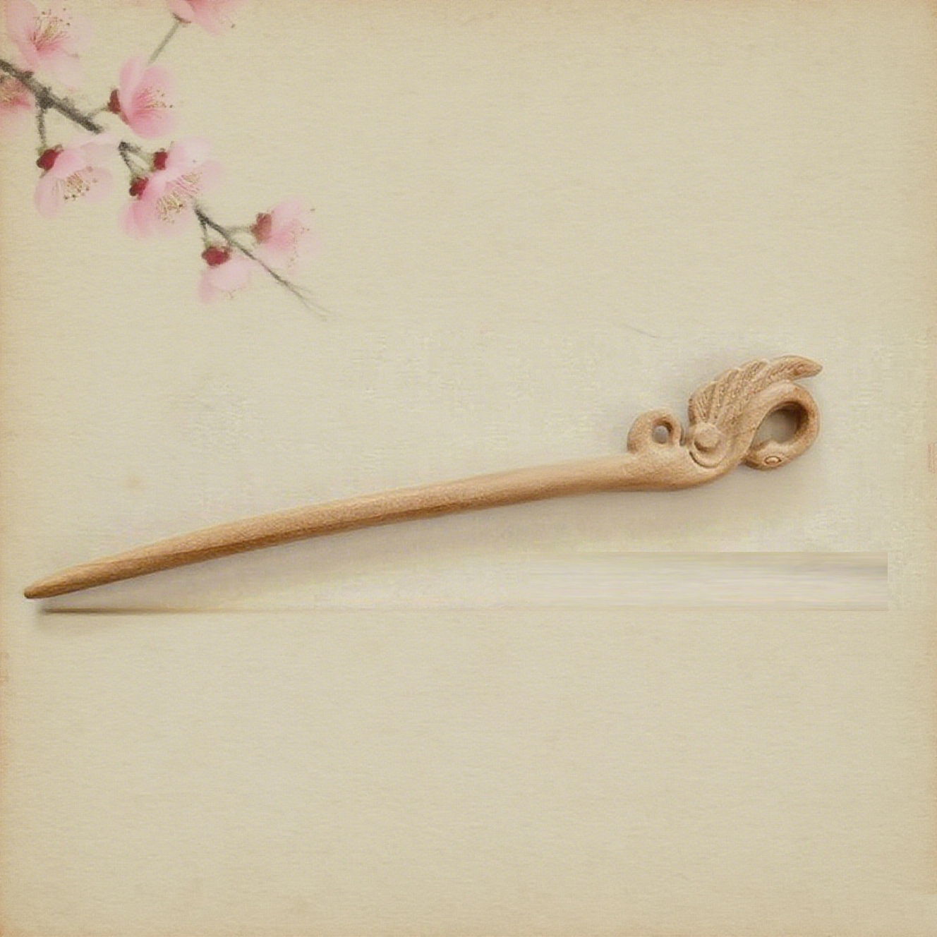伝統的な匠の技が生み出した桃木のかんざし。優美な白鳥と華麗な蝶の姿が両面に繊細な彫刻で表現された逸品です。桃木の温かな色合いと、立体的な彫刻技術が見事な調和を見せています。