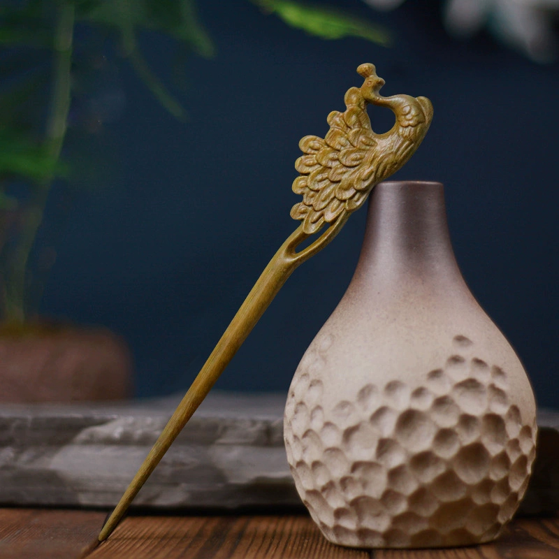 伝統的な匠の技が生み出した木製かんざし。優美な孔雀が立体的な彫刻で表現された逸品です。繊細に彫り込まれた羽根の一枚一枚まで丁寧に表現され、孔雀本来の華麗さと気品が見事に表現されています。