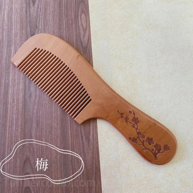 伝統的な匠の技が生み出した桃木の櫛。写真のように、四君子(梅・蘭・竹・菊)が繊細な彫刻で表現された逸品です。桃木の優しい色合いと、細やかな彫刻技術が見事に調和しています。