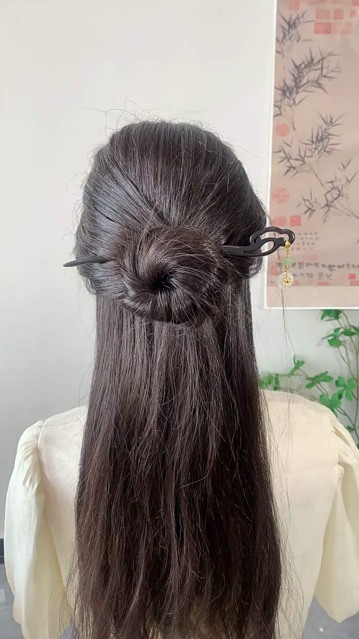 職人の手によって丁寧に彫刻された雲透かしデザインが、和装はもちろん日常のヘアスタイルにも気品と風情をプラス。先端には天然和田玉の平安扣(へいあんこう)ペンダントをあしらい、「平安・無病息災・幸せ」の願いを込めた、縁起の良い一品に仕上げました。