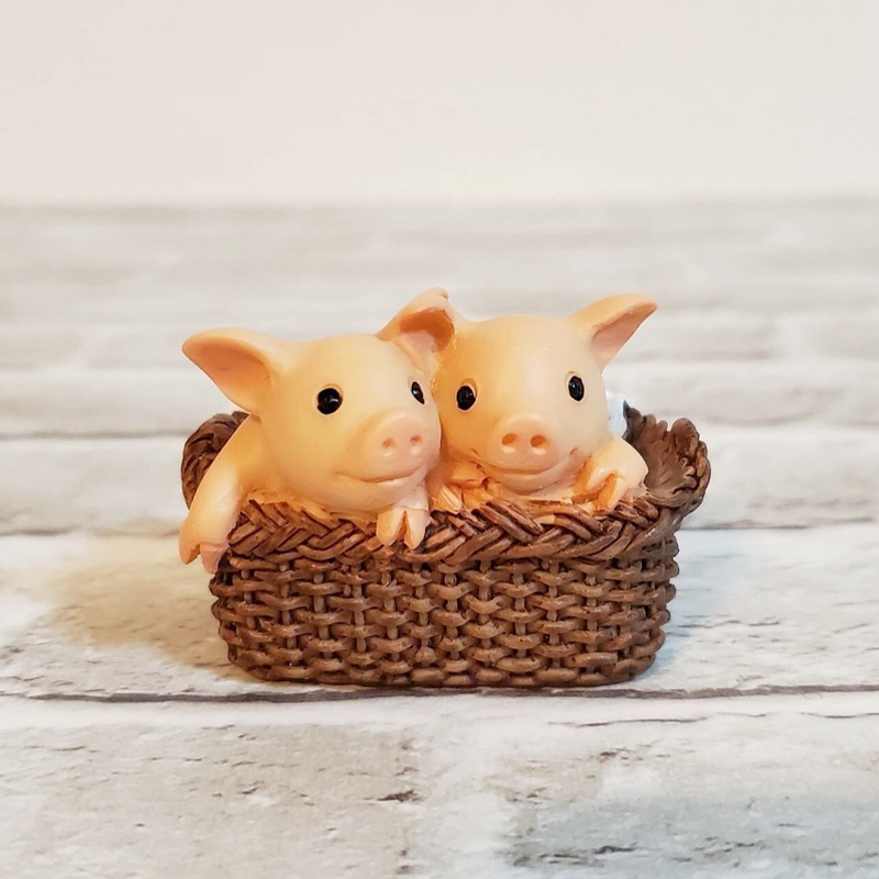 バスケットの中に納まった2匹の子ぶたの置物です。