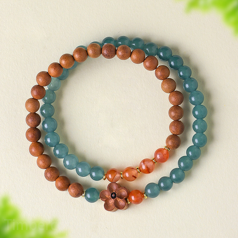 6mmの天然木珠と6mmの天然石珠が交互に連なるこのデザインは、伝統と現代、素朴と華やか、といった異なる要素の「調和」を体現しています。2 連の数珠スタイルは、そのまま腕に巻いても、ネックレスとして身に着けても楽しめるマルチウェイ仕様。中央には、細やかな木目が美しい桃木花のペンダントを配し、エスニックな雰囲気を演出しています。