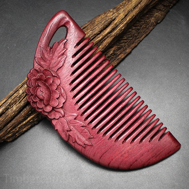 このヘアコームは、希少な紫檀を使用し、職人が丹念に牡丹の花を彫刻した逸品です。紫檀特有の深い赤紫色と美しい木目が、高級感と品格を演出します。
