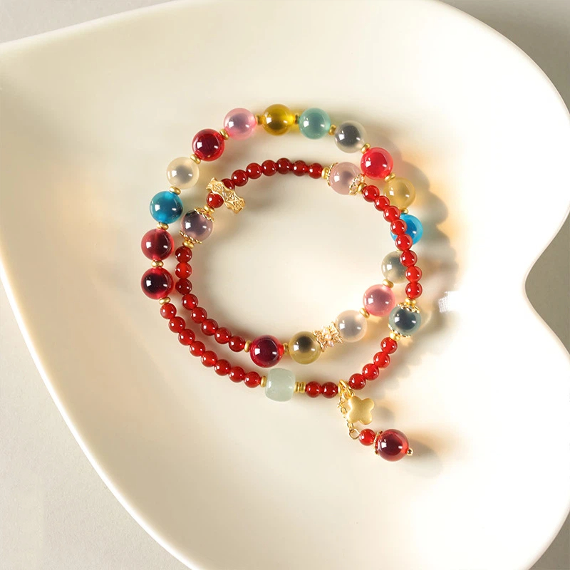一本のブレスレットの中で、大きさの異なる天然石ビーズが見事に調和。約8mmのカラフルな瑪瑙と、約4mmの深紅の瑪瑙が規則的かつリズミカルに連なり、立体感と優雅な動きを生み出しています。従来の単一サイズのブレスレットにはない、独創的でファッショナブルな印象を与えます。