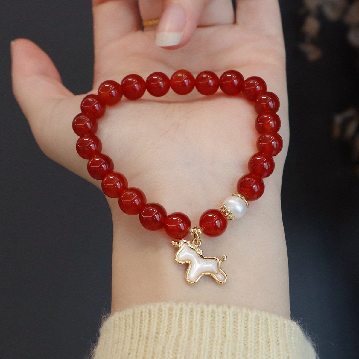 日常のお守りとして、また数珠風にも着用できるユニセックスデザイン。深い紅色を放つ天然赤瑪瑙(レッドアゲート)8mmの玉を丁寧に連ね、清らかな淡水パールと愛らしい貝母子馬チャームが華を添えます。