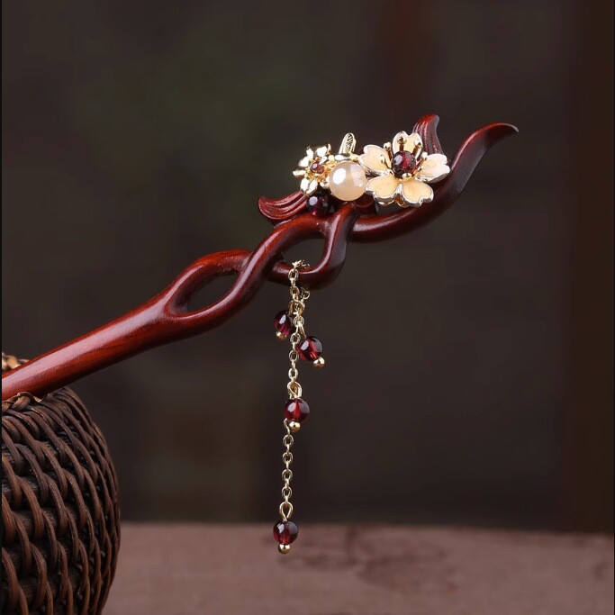 伝統的な和の美しさを現代のスタイルに融合させた、赤檀木製の簪です。上質な天然木の質感と、繊細な花飾りとチェーンの組み合わせが、どんな髪型にも優雅なアクセントを加えます。