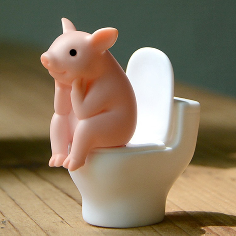 思わず目が合ってしまうトイレ中のブタの置物です。