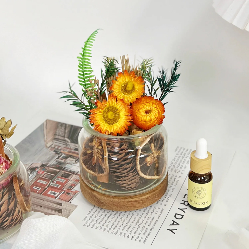 リビング、寝室、玄関、オフィスデスクなど、さまざまな空間に。精油の香りとドライフラワーの美しさが、日常にほっと一息と上質な癒しの時間をもたらします。