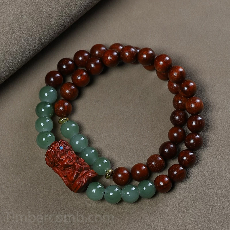 高品質な紫檀木と清々しい緑の天然石を組み合わせた、珠径 8mm のダブルリングブレスレットです。