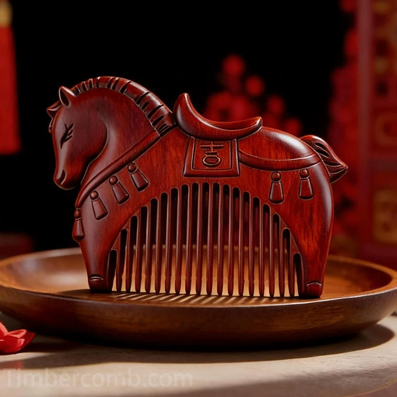 十二支の「午」を彫り込んだ紫檀木女性のための特別な櫛。重厚な天然木が静電気を抑え、細かな櫛歯が頭皮を心地よくマッサージ。十二支の縁起良い意匠が力強さと優雅さを兼ね備えた魅力を添えます。。